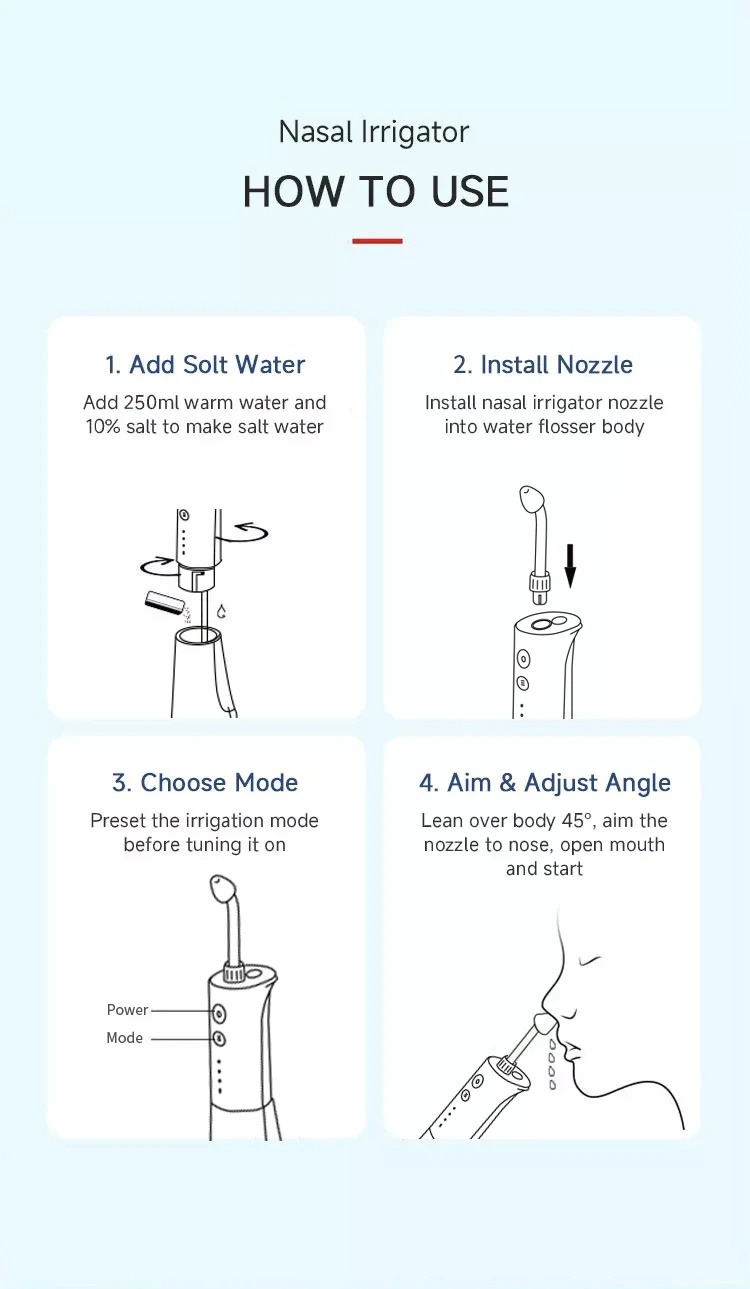 【Nastavci rotirajući za 90 stupnjeva】 Dizajn nastavka za čišćenje nosa s rotirajućim vrhom za 90 stupnjeva učinkovitiji je od Neti lonca ili drugih uređaja za ispiranje nosa. Sa IPX7 vodootpornim dizajnom, ispirač za nos omogućuje ispiranje cijelog tijela vodom, što je lakše za čišćenje i njegu vaše nosne šupljine.