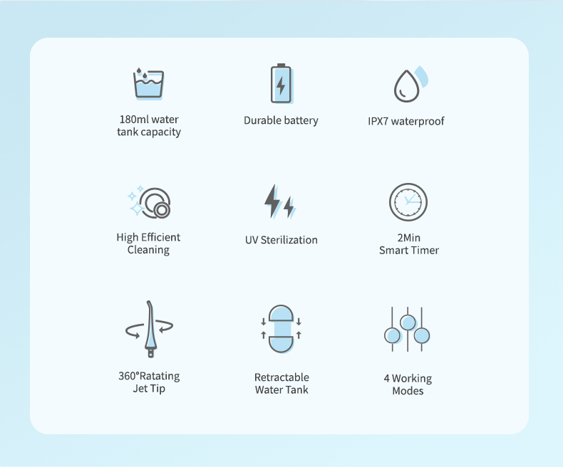 Ovaj zubni čičak s vodenim koncem isporučuje impulse visokog pritiska vode 1400-1800 puta u minuti, učinkovito uklanjajući 99,9% zubnog plaka za dubinsko čišćenje zubi. Ovaj zubni konac s vodenim koncem masira desni, potiče cirkulaciju krvi i rješava probleme usne šupljine poput lošeg zadaha, ortodontskih zuba