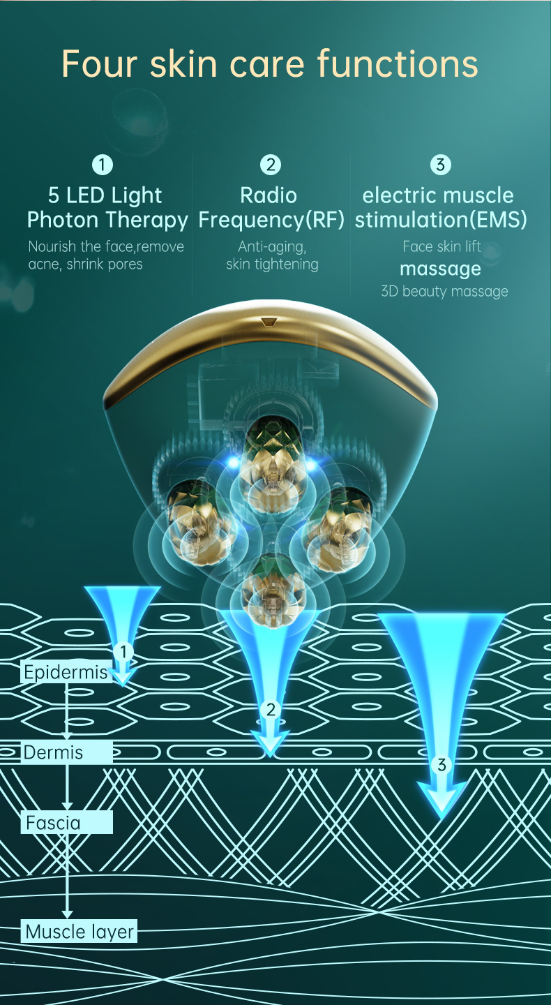 KOJE SU PREDNOSTI? -- Beauty machine je višenamjenski uređaj protiv starenja koji uključuje radiofrekvencijsku (RF) tehnologiju s terapijom crvenim/plavim svjetlom, EMS za smanjenje linija i bora, poboljšanje prodiranja u kožu i sposobnosti upijanja itd.