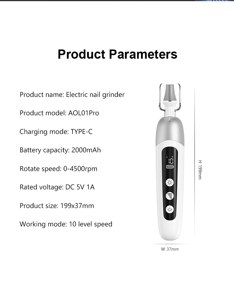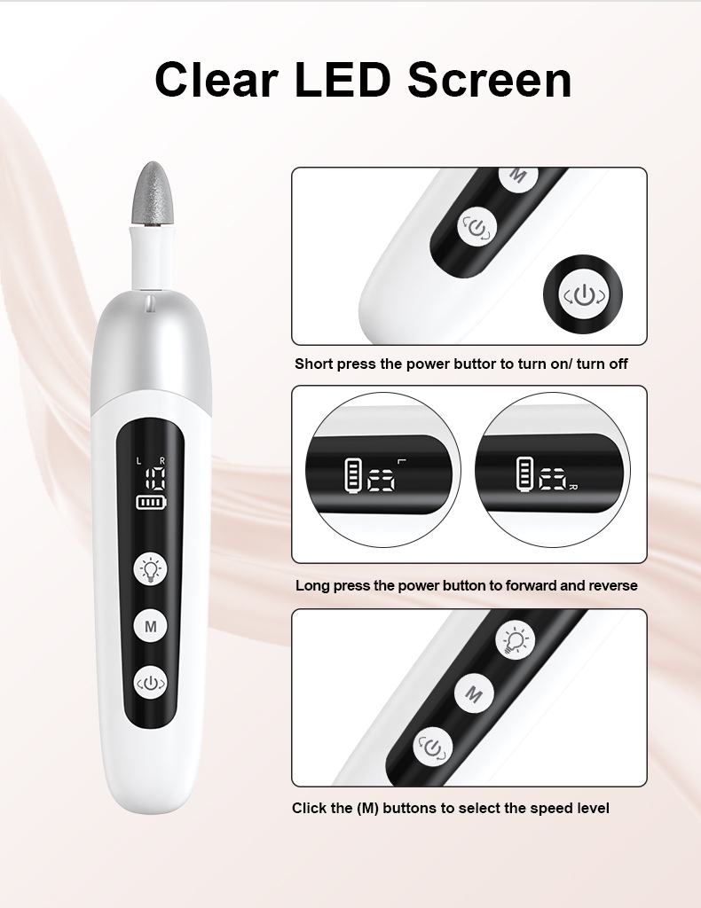 - INOVATIVNI LED ZASLON: Lako se krećite željenim postavkama. LED zaslon pokazuje status baterije, željenu brzinu i postavke rotacije za rad bez napora. Električna turpija za nokte također je opremljena integriranim LED svjetlom koje osvjetljava područja na rukama i nogama