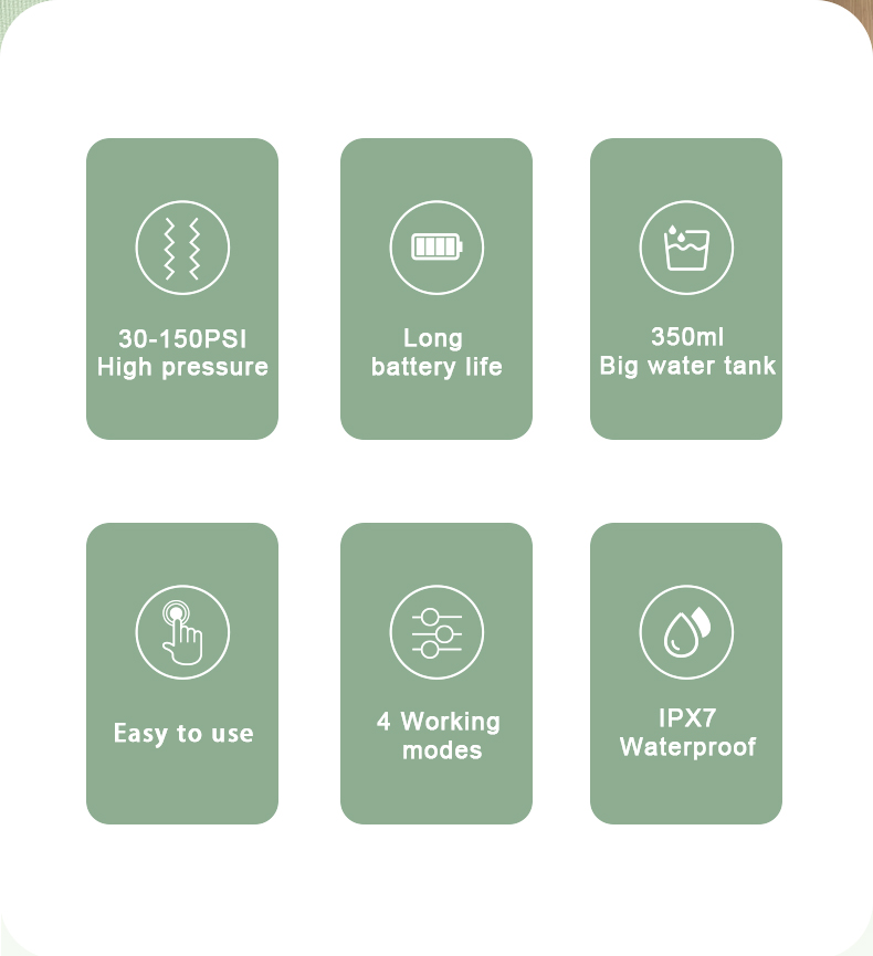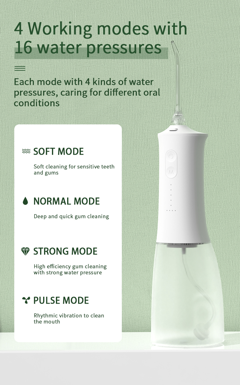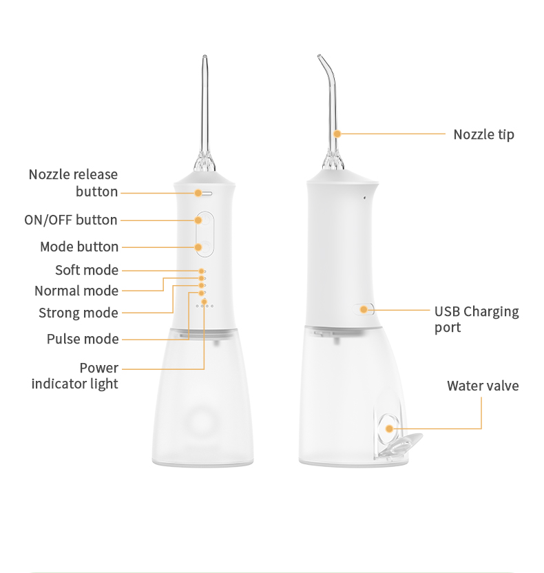 Ova vodena zubna šilica daje impulse visokog pritiska vode 1400-1800 puta u minuti, učinkovito uklanjajući 99,9% zubnog plaka za dubinsko čišćenje zubi. Ova vodena zubna šilica masira desni, potiče cirkulaciju krvi i rješava probleme usne šupljine poput lošeg zadaha, ortodontskih zuba