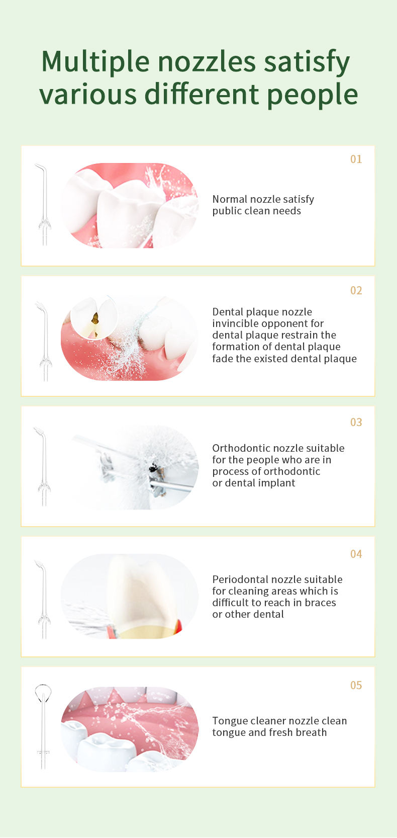 Profesionalno ocijenjen od strane američkog stomatološkog tima, naš konac za zube nudi pet prikladnih načina rada koji odgovaraju različitim potrebama 99% različitih dobnih skupina, a istovremeno osiguravaju optimalnu učinkovitost i životni vijek. Njegova ergonomska ručka i 6 izmjenjivih mlaznica osiguravaju udobno i svestrano iskustvo. To je promišljen dar za rođendane, Božić, Dan zahvalnosti, Valentinovo, Majčin dan očeva ili brigu o oralnom zdravlju vaših najmilijih