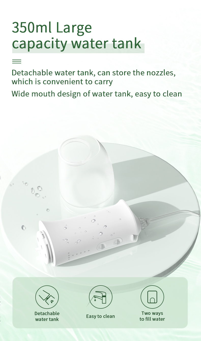 Ovaj vodeni konac za zube ima nadograđeni spremnik za vodu od 350 ml, dvostruko veći od kapaciteta ostalih starih modela, eliminirajući potrebu za čestim punjenjem i čineći vaše oralno čišćenje praktičnijim i učinkovitijim